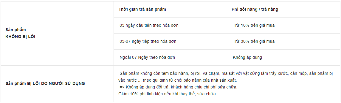 Sản phẩm đã mua không quá 07 ngày tính theo hóa đơn mua hàng.