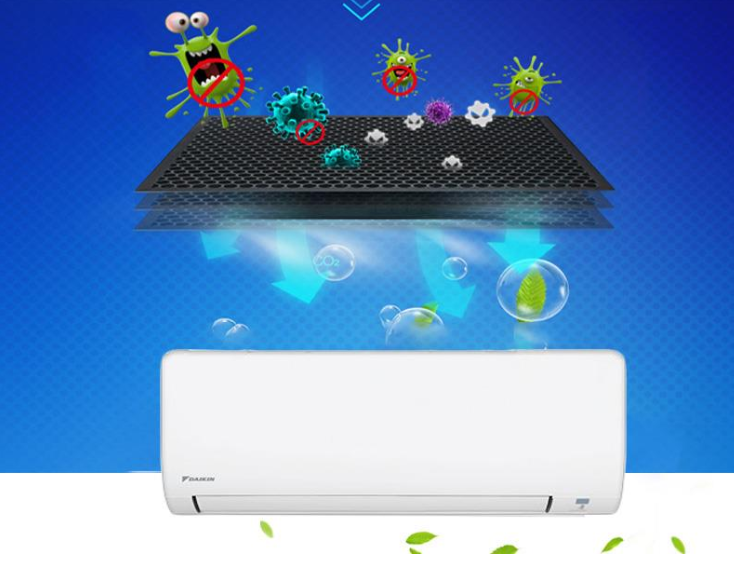Máy lạnh Daikin được trang bị tấm lọc vi bụi và phin lọc khử mùi xúc tác quang Apatit Titan nên người dùng có thể yên tâm về sức khỏe khi sử dụng máy lạnh này. Tấm lọc vi bụi có khả năng lọc sạch vi khuẩn và bụi bẩn trong không khí, kết hợp với phin lọc giúp khử mùi tối ưu, mang đến không gian sống trong lành, sạch khuẩn cho người dùng.