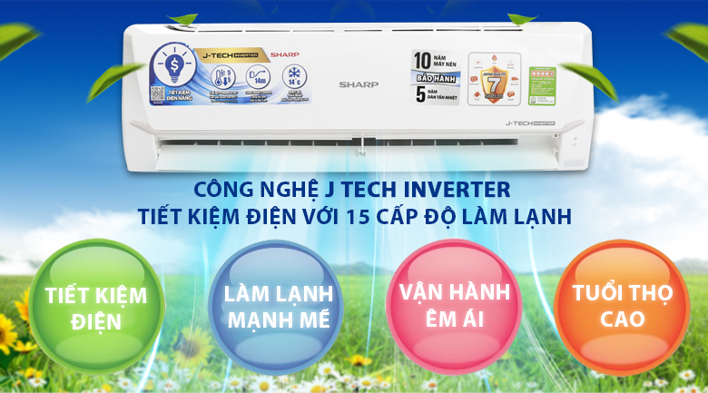 Điều hòa Sharp được trang bị công nghệ J-Tech Inverter được cải tiến từ công nghệ Inverter thông thường. Nhờ mạch điện đổi chiều, máy lạnh duy trì và điều chỉnh nhiệt độ bằng cách thay đổi các cấp độ làm lạnh khác nhau. Nguyên lý này giúp gia đình bạn tiết kiệm tới 60% lượng điện tiêu thụ.