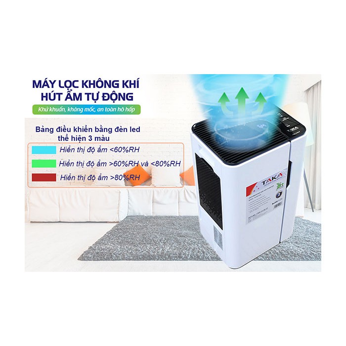 Máy lọc không khí và hút ẩm Taka TK-ED12AF: với hệ thống lọc không khí 5 cấp: TVOC, HEPA, Carbon, UV, Anions giúp lọc không khí và khử sạch mùi hôi, ẩm thấp, nấm mốc trong mùa nồm hiệu quả.