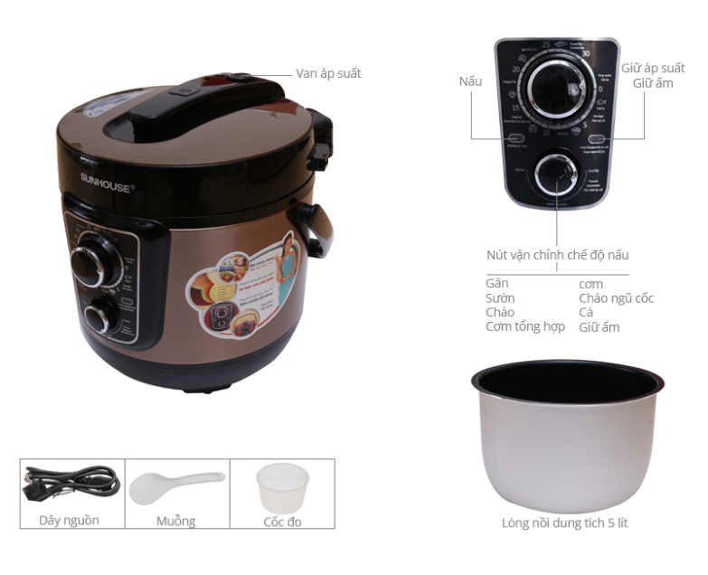 Nồi áp suất SUNHOUSE SHD1659 với công suất lớn 900W cùng nhiều chế độ nấu khác nhau, giúp bạn có thể nấu được nhiều món như hầm gân, súp, cháo, gà, canh...