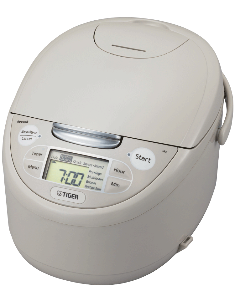 NỒI CƠM ĐIỆN TIGER JAX-S10W 1L: với 9 chế độ nấu, lồng tráng men chống dính bằng tia hồng ngoại dầy 1.5mm với thiết kế 3 vòng nhiệt giúp cơm chín nhanh hơn mà hạt cơm không bị nát và không bị khô trong quá trình giữ ấm cơm, với chế độ nấu “Tacook” được tích hợp để vừa nấu cơm và vừa nấu thức ăn cùng một lúc giúp tiết kiệm thời gian, màn hình LCD, 2 chế độ hẹn giờ nấu, có quai xách, chức năng giữ ấm cơm đến 12h, cốc đong gạo, muỗng xới cơm, muỗng múc cháo/soup, khay nấu đồng thời, sách hướng dẫn các thực đơn nấu ăn kèm theo sản phẩm, màu xám be.